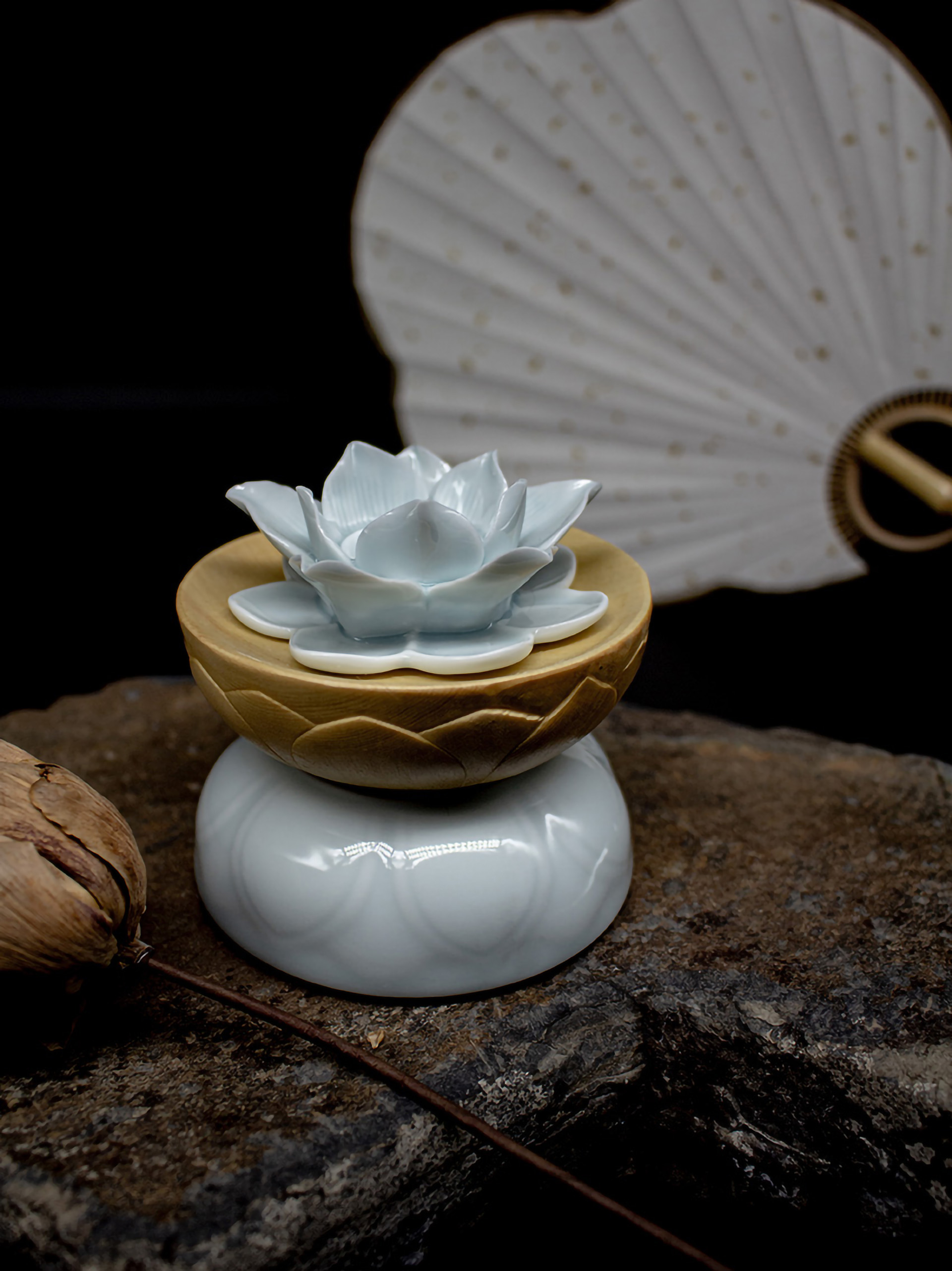 画面上加入了同时出土的文物「鹿」,与「莲」共为主体。以鹿腾跃的样子,唤醒沉睡了万年的莲。用材质本身还原“出淤泥而不染”的场景,朴而不拙,雅而不作。细线勾勒画面,营造清静、悠然意境。是香器,更是赏器。